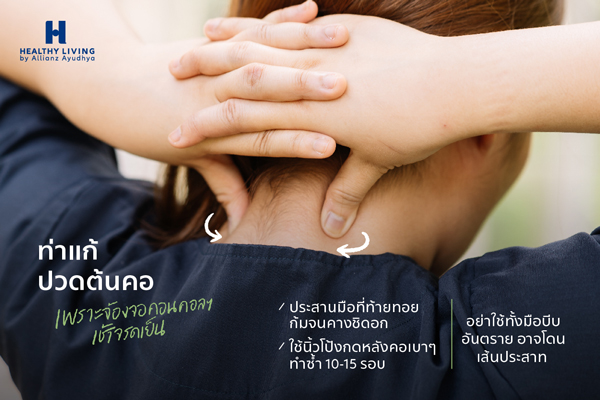 การใช้นิ้วโป้งไล่นวดบริเวณคอ จะช่วยผ่อนคลายกล้ามเนื้อที่เกร็งเป็นเวลานานได้ คุณหมอเพิ่มเติมว่าควรหลีกเลี่ยงการใช้มือไล่บีบไปเรื่อยๆ เหมือนที่หลายคนชอบทำ เพราะที่คอมีเส้นประสาท เมื่อบีบมั่วๆ อาจพลาดไปโดนเส้นประสาทจนทำให้เป็นอันตรายได้ การใช้นิ้วโป้งกดจุดจึงปลอดภัย ตรงจุดพอดี และกะน้ำหนักได้ง่ายกว่า