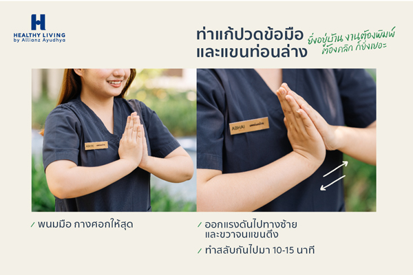 หากเริ่มรู้ตัวว่าใช้มือนานเกินไปแล้ว ควรพักด้วยการพนมมือแล้วดันข้อมือซ้ายขวาสลับไปมา ทำให้สุดจนรู้สึกตึงบริเวณข้อมือถึงแขน เมื่อทำอย่างต่อเนื้อสลับกันไปประมาณ 10-15 นาที จะช่วยคลายกล้ามเนื้อบริเวณแขนที่เกร็งจากการพิมพ์งานนานๆ ได้